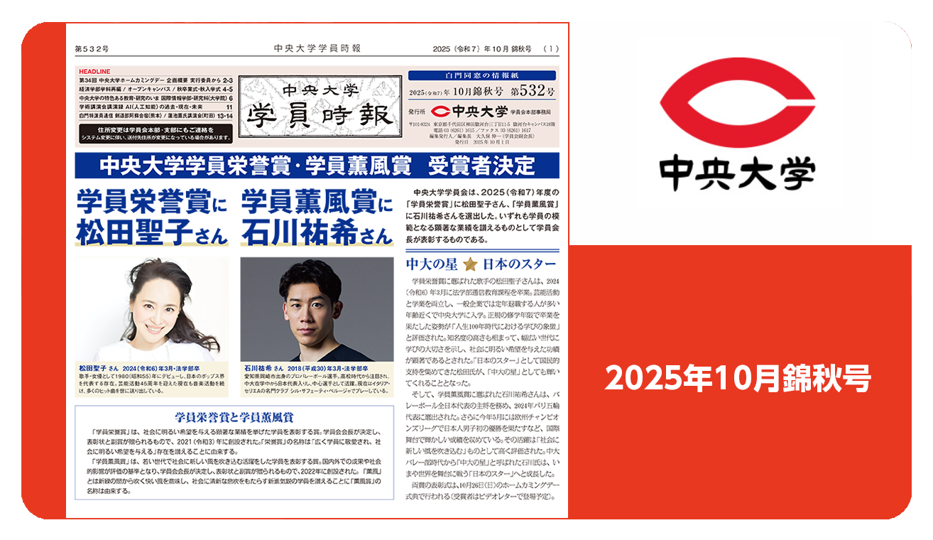 INFORMATION 学員会事務局の冬季閉室期間について2025年11月27日 白門レガッタ2025 6年ぶりの開催2025年11月11日 「未来へ繋ぐ『光』を灯したい」中央大学資料館クラウドファンディング、スタート!2025年11月5日 第9回白門駅伝大会 467名が参加2025年11月5日 茗荷谷キャンパス白門祭キミハルシネマ2025『ぐるぐる回るよ』2025年10月31日 お知らせ一覧を見る 白門レガッタ2025 6年ぶりの開催2025年11月11日 第9回白門駅伝大会 467名が参加2025年11月5日 クラウドファンディング実施中です皆さんの応援で成立します!2025年10月9日 今年度が最終年となった白門飛躍募金へのご協力をお願いします2025年10月9日 市ヶ谷田町キャンパス・市ヶ谷界隈2025年10月6日 中央大学、創立140周年記念企画展を開催2025年10月6日 学員インタビュー 各界で活躍する学員への取材記事を掲載 支部だより 福井県支部 創立120周年記念式典を開催2025年11月13日 福井県支部 … 続きを読む: 福井県支部 創立120周年記念式典を開催 白門三三会 令和7年度定期総会・懇親会開催2025年10月31日 白門三三会支部 … 続きを読む: 白門三三会 令和7年度定期総会・懇親会開催 藤沢白門会 創立30周年記念式典を開催2025年10月28日 藤沢白門会支部 … 続きを読む: 藤沢白門会 創立30周年記念式典を開催 東京世田谷区支部 小雨と寒さの中でのゴルフコンペ2025年10月28日 東京世田谷区支部 … 続きを読む: 東京世田谷区支部 小雨と寒さの中でのゴルフコンペ 日野支部 みんなと一緒の運動会に参加2025年10月28日 日野支部 … 続きを読む: 日野支部 みんなと一緒の運動会に参加 支部だより一覧を見る 学員会ページ入会やサービス紹介登録情報の変更はこちらから 学員会とは Pickup Contents お知らせ 白門人インタビュー 白門人力士 最新号の紹介 バックナンバー 支部だより 支部長・幹事長交代のお知らせ 支部のページ