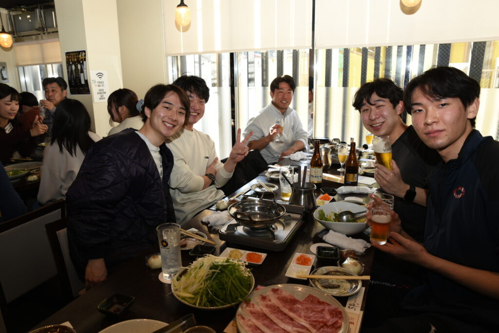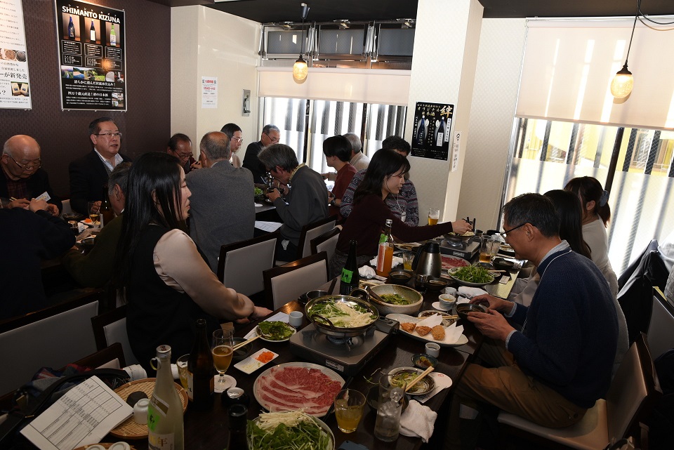 その後、新年会の会場へ徒歩で移動。田中支部長(昭和57年卒)による開会の挨拶に続き夏井相談役(昭和42年卒)の乾杯の発声で開宴。初参加の方、久しぶりに参加された方、毎度おなじみの方々、親しく歓談をした後、参加者全員による自己紹介・近況報告を行い楽しく過ごすことができました。特に現役学生(レスリング部3名、混声合唱団4名、フェンシング部4名)からは、昨年の大会・活動の報告や今年の意気込みについて力強く語っていただきました。日野支部として、南平寮(日野市南平)のお膝元の地域支部として、今後も現役学生を応援し交流を続けていくことを確認。混声合唱団のリードによる校歌斉唱で締めお開きとなりました。
