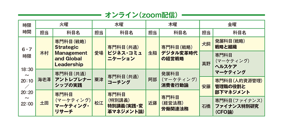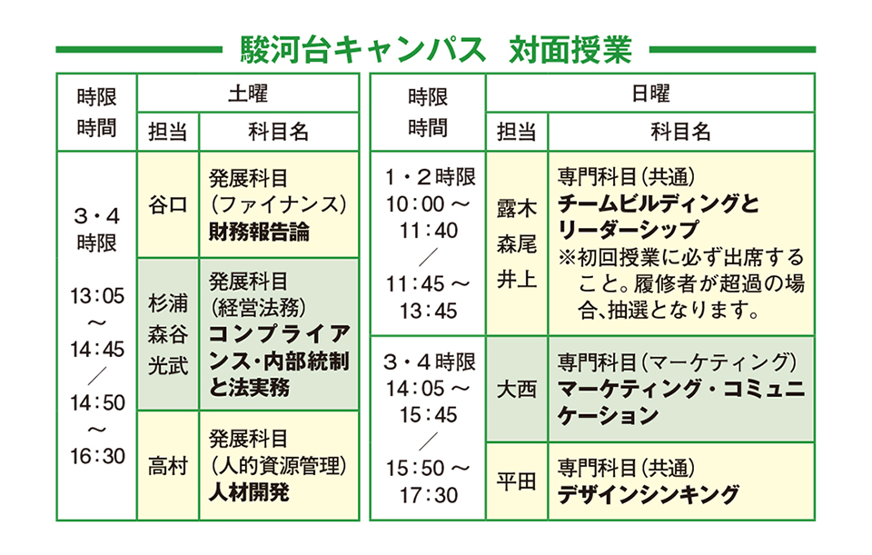 後期前半(M3/令和7(2025)年9月21日から11月9日まで)毎週平日18:30~22:00(オンライン講義)または土日対面講義(駿河台キャンパス)、計7回講義開講。対象講座(下表)から受講希望の科目を1つお選びください。