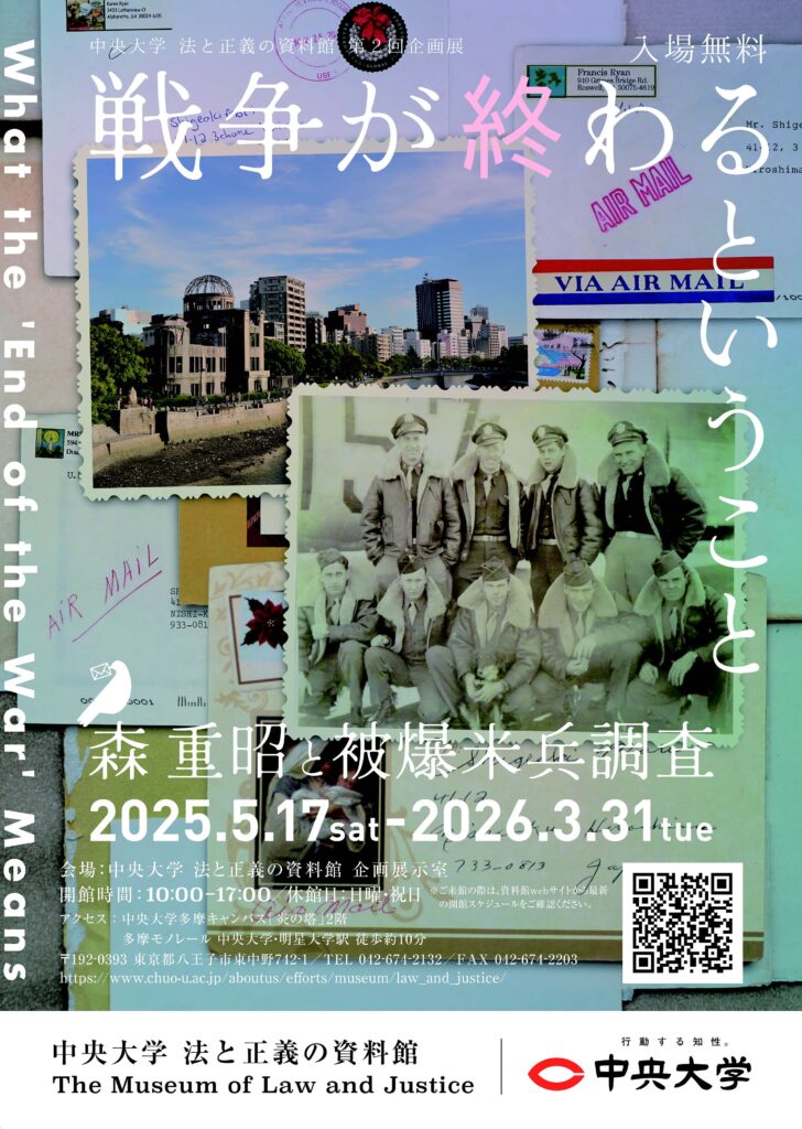 本年はアジア・太平洋戦争の終戦から80年となる。「法と正義の資料館」の第2回目の企画展「森重昭と被爆米兵調査―戦争が終わるということ」では、こうした節目に、平成28(2016)年5月27日にオバマ氏が現職大統領として初めて広島を訪問した際、被爆者代表として抱擁を交わした本学出身者・森重昭氏とその活動にフォーカスしていく。