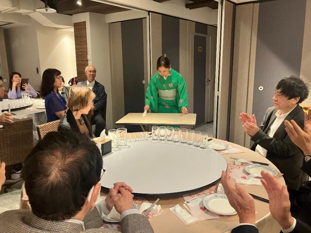 台湾白門会~9名が参加総勢28名の盛大な懇親会となった。松本会長の挨拶の後、サプライズゲストとして一龍齋貞奈女流講談師(今回ツアーに同行・2009年商卒・二つ目)の講談会 を実施、演目は新幹線車内で考えたという新作講談「台湾鉄道の父・長谷川謹介」を披露万雷の喝さいを浴びた。同講談師にとっては初の海外講談会となった。