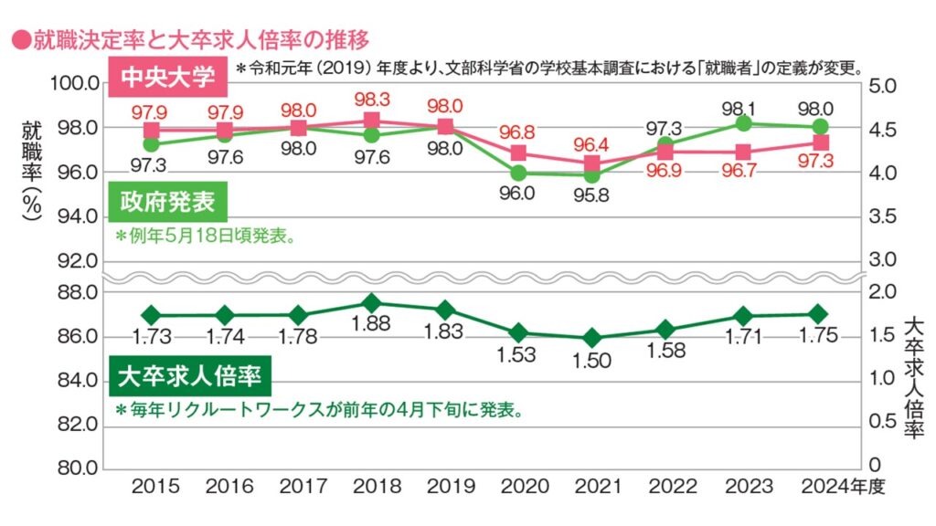 中央大学キャリアセンターがまとめた令和6(2024)年度卒業生の就職状況によると、学部卒業生の就職決定率は97.3%となり、前年度比0.6ポイント増と高水準を維持した。