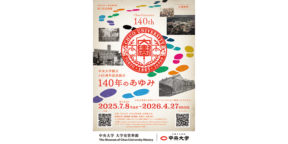 中央大学大学史資料館は、創立記念日にあたる令和7(2025)年7月8日(火)から企画展示「中央大学創立140周年記念展示 140年のあゆみ」を同資料館企画展示室で開催する。