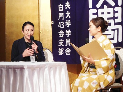 今回の記念講演会は、前半が講談師の一龍齋貞奈さん(中央大学出身)による講談「スズキジムニー誕生」、後半はシドニーオリンピックの銅メダリスト(水泳メドレー)の田中雅美さんと一龍齋貞奈さんによるトークセッションでした。