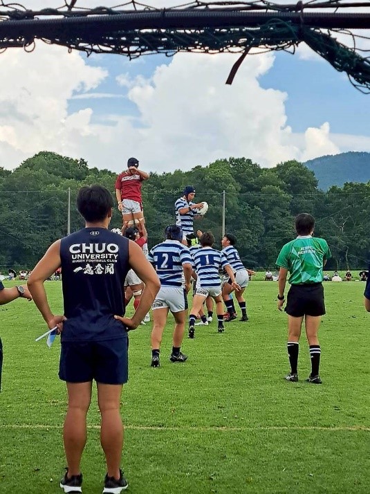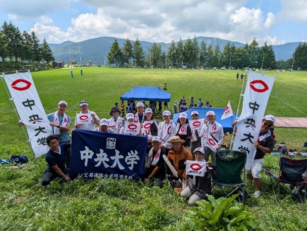 「中央大学」の旗を掲げ、父母連絡会と支部メンバーが一丸となって応援!菅平の青空の下、笑顔が弾けます。