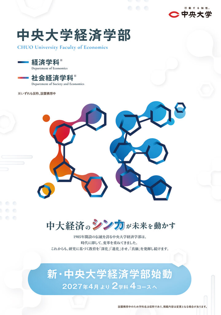 経済学部の2年後の学科再編は、中長期戦略「Chuo Vision 2025」の一環。学科再編により経済学部の魅力を高め、大学全体のブランド力向上につなげることも目的。新設される2学科の特徴・概要は以下の通りである(学員時報取材。設置構想中のため学科名は仮称、掲載内容は変更となる場合がある)。