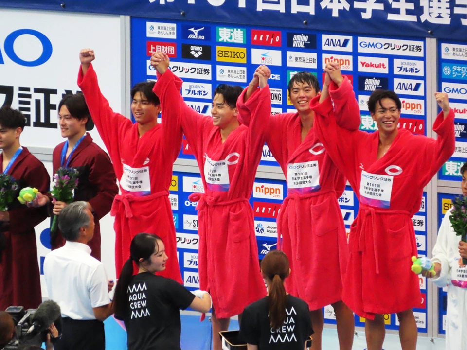 大好きな中央大学競泳部、そのメンバーとずっと目標にしていた優勝を果たすことができて本当に嬉しい。個人種目は悔しい結果だったが、リレーで仲間を信じて金メダルを取れたのは僕の一生の誇りです。中大最強!