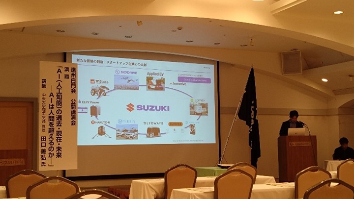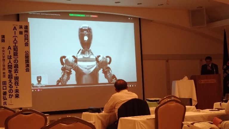 次に、中央大学が全国支部会と連携して実施している学術講演会を開催しました。今年の講話は、理工学部の田口善弘教授による「AI(人工知能)の過去・現在・未来―AIは人間を超えるのか―」を選択、昨今様々な分野で急速に導入や活用が進んでいるAI(人工知能)について、その技術進歩の変遷をわかりやすく解説していただき、簡単な言葉の入力だけで作曲まで手掛ける最先端のサービスまで知ることができました。