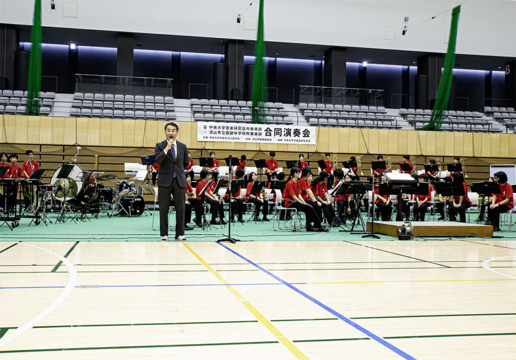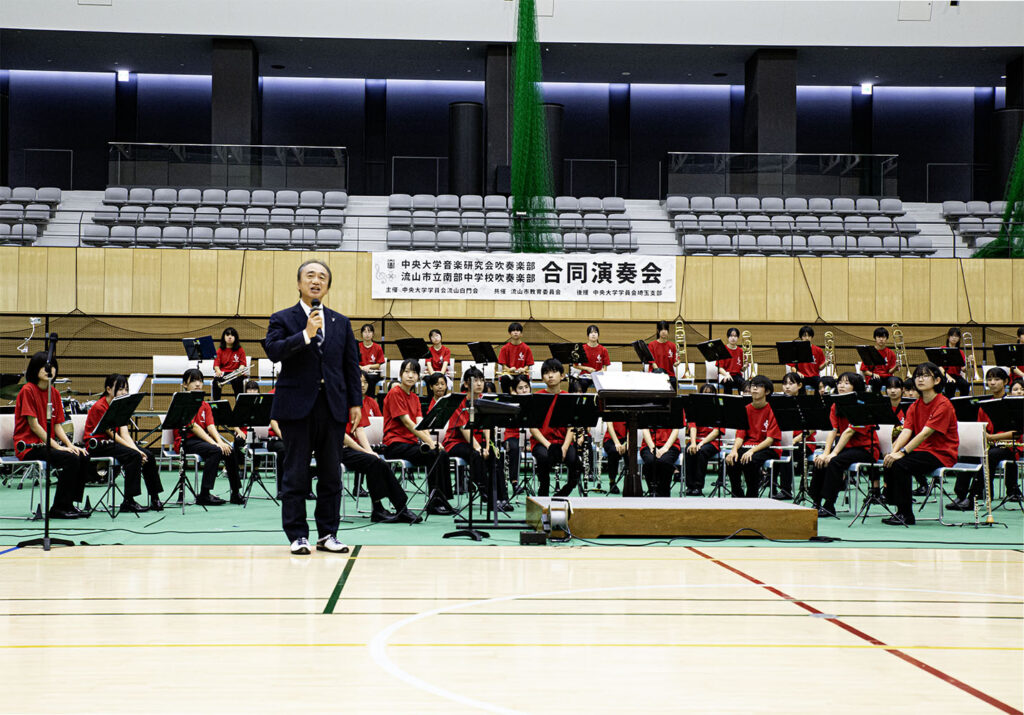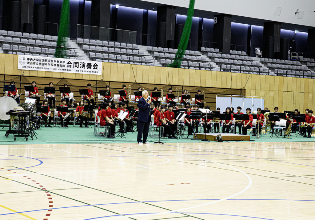 流山白門会は、2025(令和7)年10月12日(日)流山市総合体育館(キッコーマンアリーナ)において流山市立流山南部中学校吹奏学部と中央大学音楽研究会吹奏楽部の合同演奏会を企画実施しました。概ね、招待客を含めて八百人を超える参加があり、出演者及びボランティアスタッフ等の百八十名を加えると千人規模のイベントになりました。
