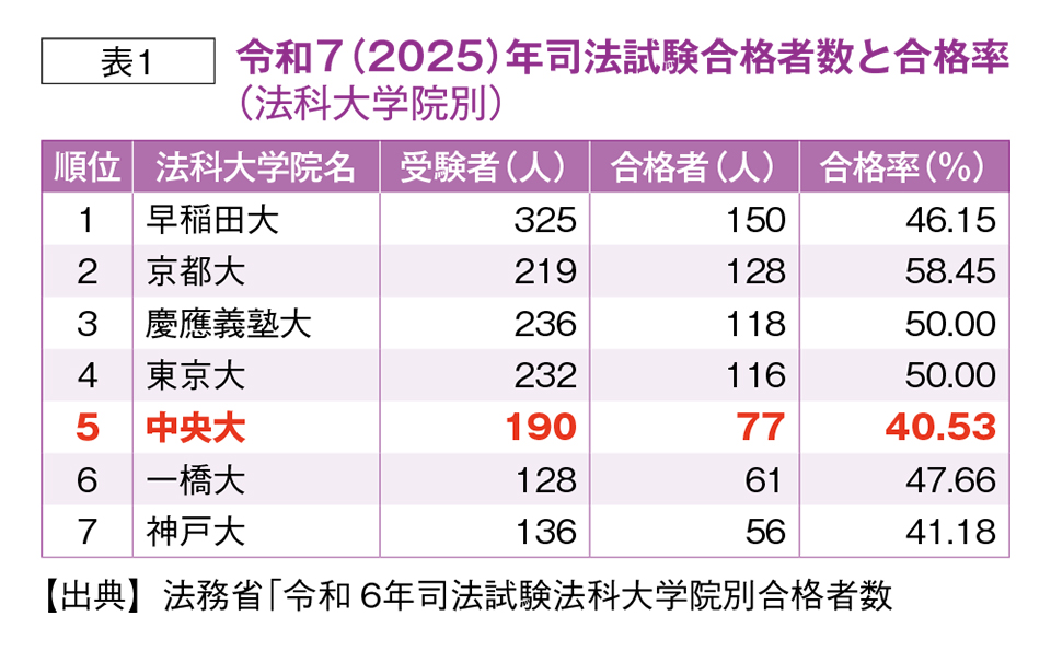さて、2025年11月12日(水)に、本年の司法試験の合格発表があり、中央大学法科大学院は、受験者190名中77名が合格しました。受験者100名以上の法科大学院で比較すると、人数では全国5位、合格率(40.53%)では全国8位でした。