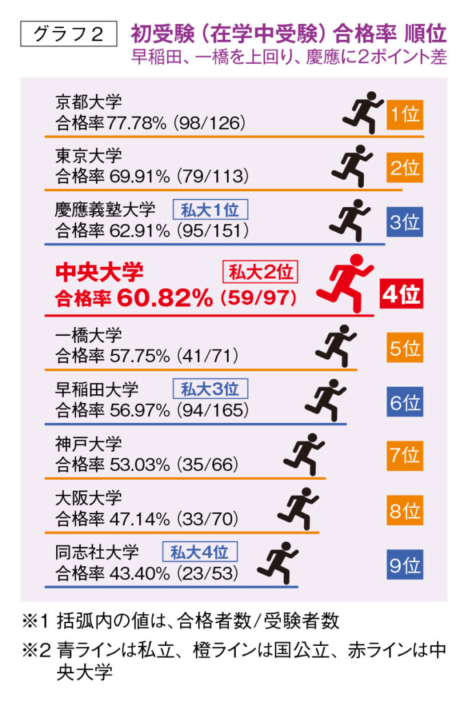 また、在学中及び修了1年目受験者の合格率(=2回以内合格率)も55.91%で、受験者50名以上の法科大学院で比較すると、ここでも全国4位(私大2位)となりました。これも、早稲田大学・一橋大学を上回り、慶應義塾大学に肉薄する数字です。