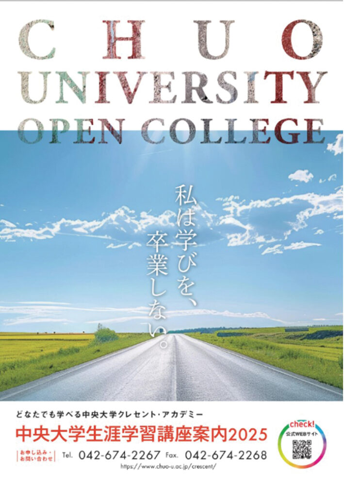 中央大学オープンカレッジ「クレセント・アカデミー」は、学業を終え社会に出た後も学び直しや教養を高めたい人に向けて、実務・教養・文化など多彩な講座を開講している生涯学習機関(オンラインと対面の双方対応)である。専門家による講義を通じて、受講者に新たな知識に触れる機会を提供している。