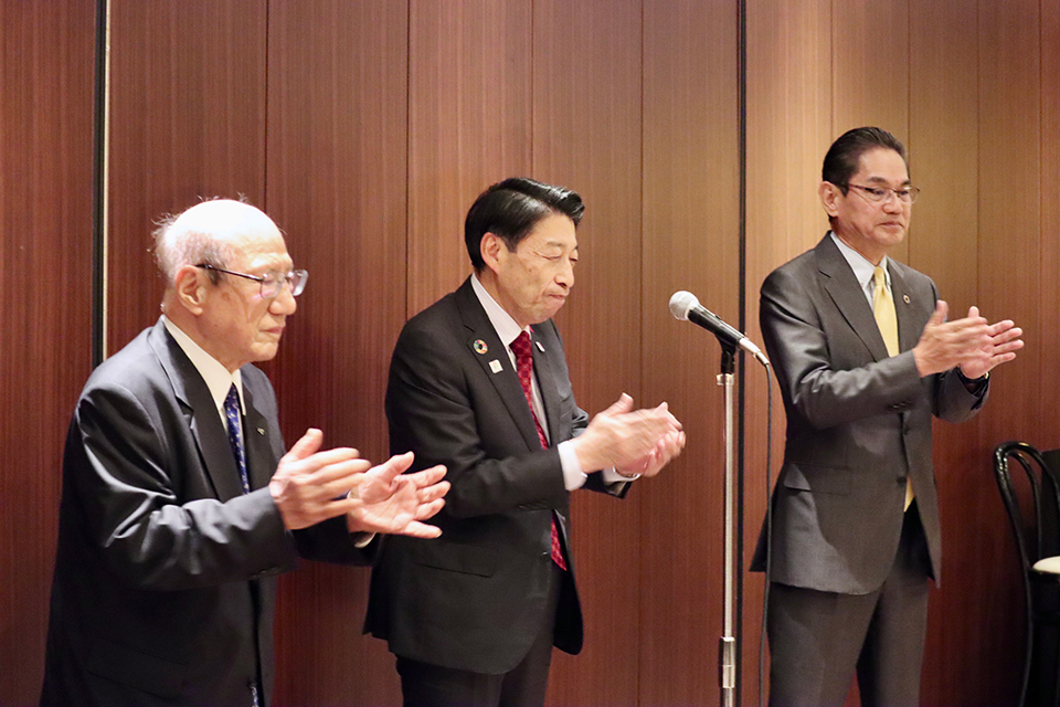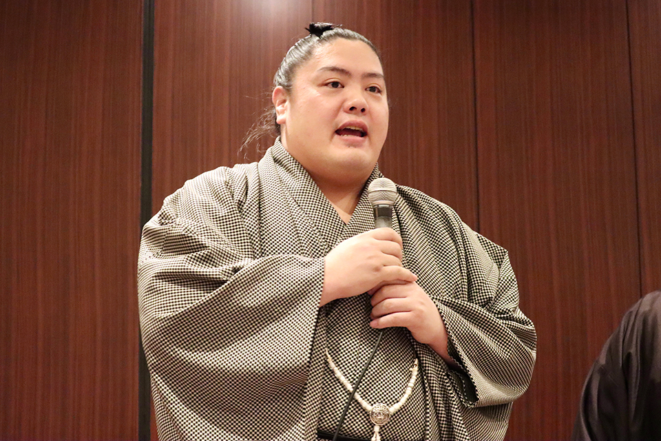 同会設立の経緯について、発足時からの世話人の一人である片山隆之事務局長(昭37経)は「30年前に当時の高木友之助学長から〝文学部出身の十両・武哲山を福岡で応援してくれ〟と頼まれたのが発端。学員会福岡支部の仲間と継続的に応援しようと会の設立に至った。13名で始まった会も、いまや50名近い会員となった」と経緯を紹介。さらに「現在の世話人の石橋氏をはじめ、九電工歴代社長や服部知事ら著名な卒業生と、現役力士・親方とが語り合える場は中央大学ならでは」と語り、会の意義を強調した。