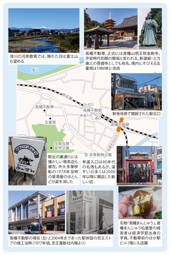 京王線高幡不動駅周辺は、この20年で街なみが大きく変わった。大きな変化は2000年の多摩モノレール開通とその後の駅舎の改良。かつての中大生の“足”は京王動物園線(1964年開通)からモノレールにシフトした。駅界隈は、昔から多摩動物公園や多摩丘陵一帯をめぐる散策の拠点としても親しまれてきたが、昔を知る人はその変化に驚くはずである。