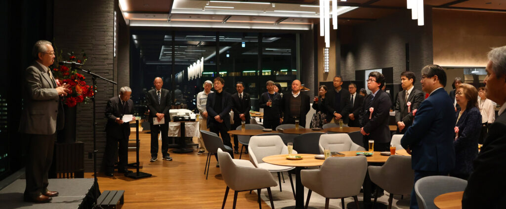 続いて、今回も駿河台キャンパス19階のGood View Diningを貸し切りにて開催した忘年会には、谷井先生、植野先生のほか、信窓会顧問であり令和8年1月1日付で日本私立学校振興・共済事業団理事長に再任された福原紀彦先生(中央大学名誉教授・前学長)、同じく信窓会顧問である佐藤信行先生(中央大学法科大学院教授・副学長)、通信教育部から森光先生(中央大学法学部教授・通信教育部長)、田川博士通信教育部事務長にもご出席いただきました。美味しいお料理をいただきながら直近の秋の卒業生・新入会員1名、在学生2名を含む計45名の出席者全員が、過去、現在、そして未来の法学部通信教育課程という共通の話題で盛り上がり、年末に大いに懇親を深めることができました。