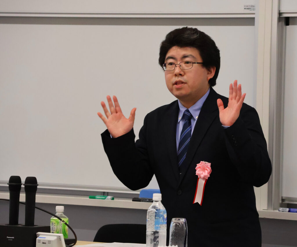 年末講演会は、谷井悟司先生(中央大学法学部准教授)に「インターネット上の誹謗中傷に対する刑法的規制の在り方」と題してご講演いただきました。今回の講演会もハイフレックス型にて開催し、将来の会員である全国の在学生を含め、会場40名、オンライン(Zoom)24名、計64名にご参加いただきました。会場では、中央大学学員会から芳井敬一会長のご名代の植野妙実子副会長(中央大学名誉教授)にもご参加いただきました。