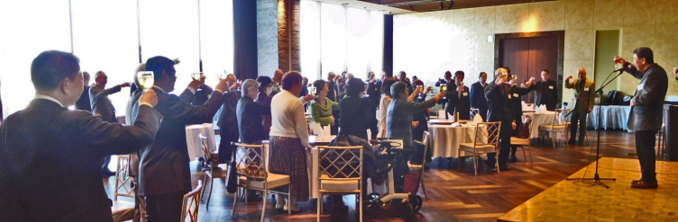 最初に集合写真の撮影をしてから、会が開催されました。最初に司会を担当する星野副会長が開会の言葉を述べ、続いて元応援団の小塚副会長のリードの下で校歌を斉唱しました。その後、清家会長が挨拶を述べられました。新年を祝うとともに、43会および会員にとって恙ない良い年であるようにとの思いを述べられました。