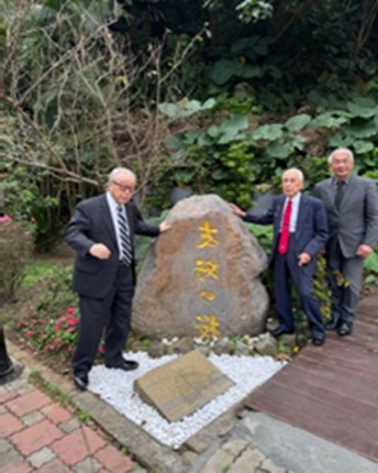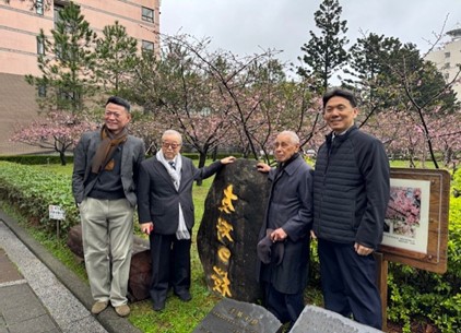 世新大学友好の桜記念碑・三分咲きの桜前にて 陳学長(右)・長田名誉会長・松本会長